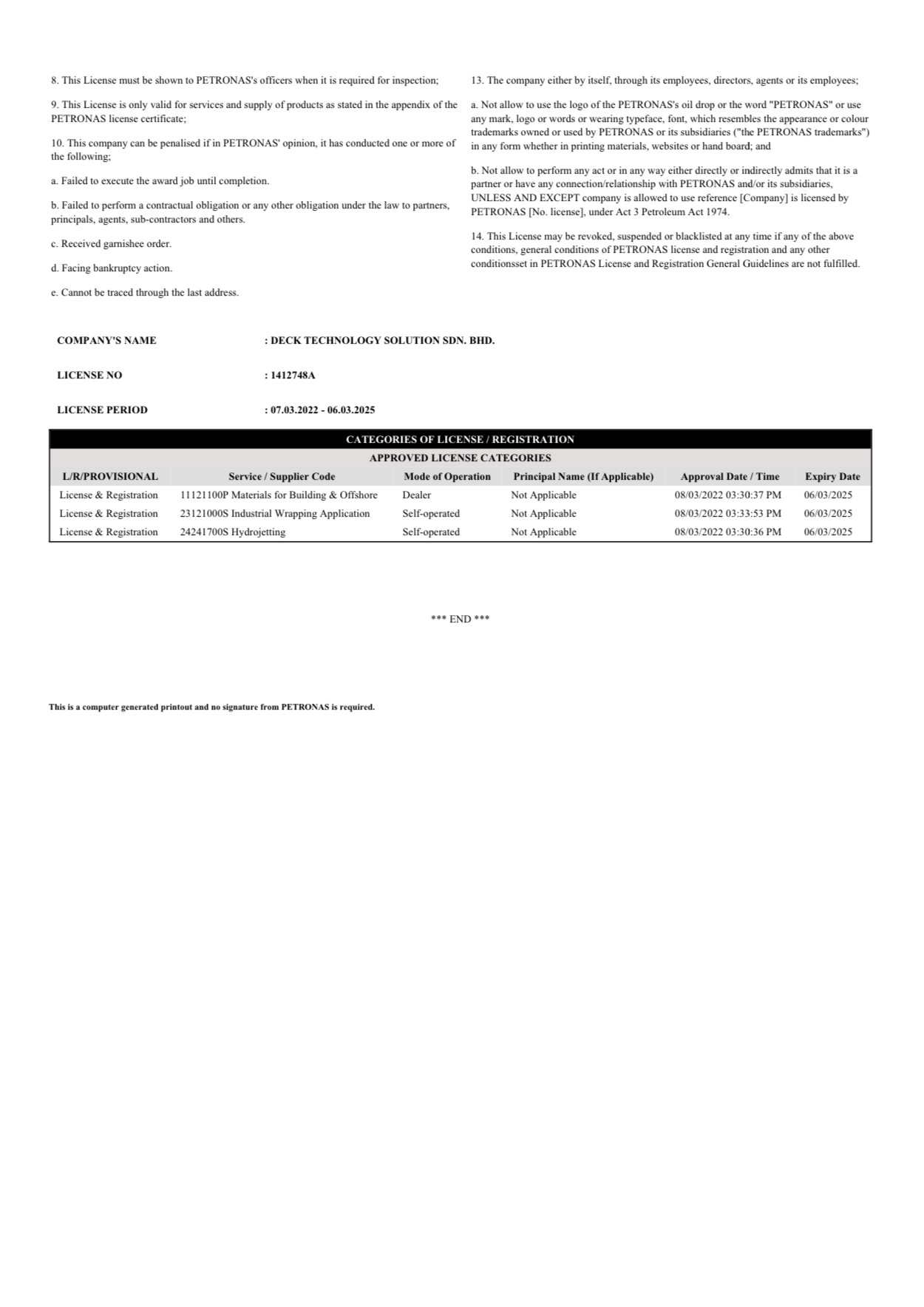 - Deck Technology Solution also registered with CIDB and PETRONAS (license)